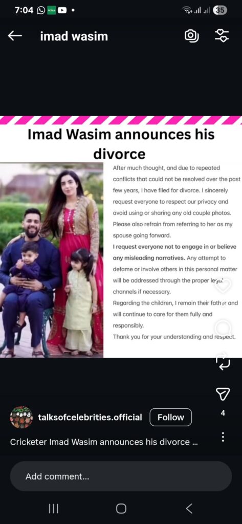 In his statement, Imad Wasim requested fans, media, and the public to respect his privacy and avoid sharing old couple pictures or spreading misleading narratives. He also clarified that his former partner should no longer be referred to as his spouse.